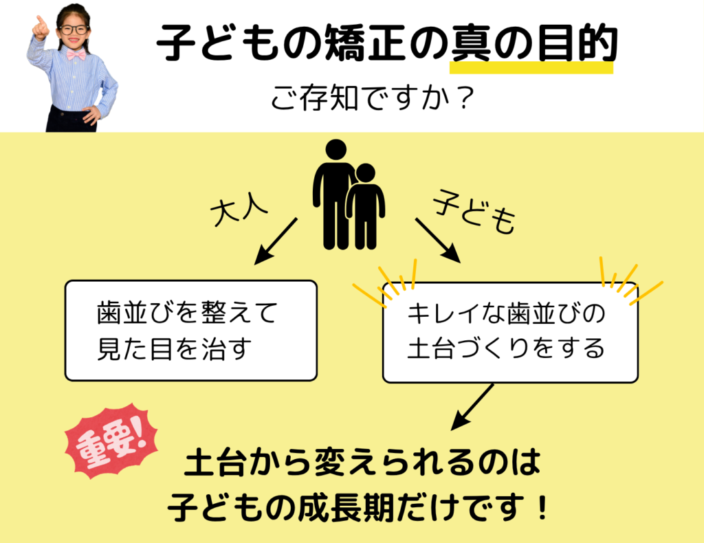大人の矯正の目的は「歯並び=見た目を整える」ことですが、一方で子どもの矯正(小児矯正)の目的は「歯並びの土台作り」です
