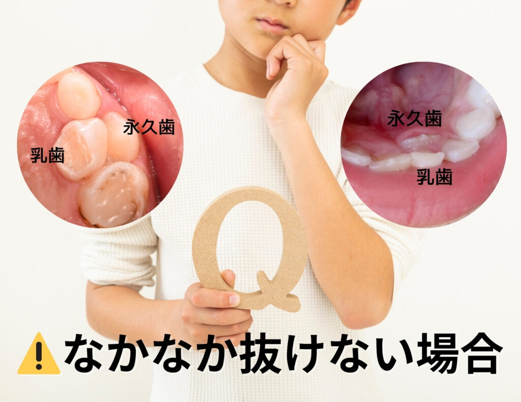 時に、永久歯が下や横から生えてきているにもかかわらずなかなか乳歯が抜けない場合があります