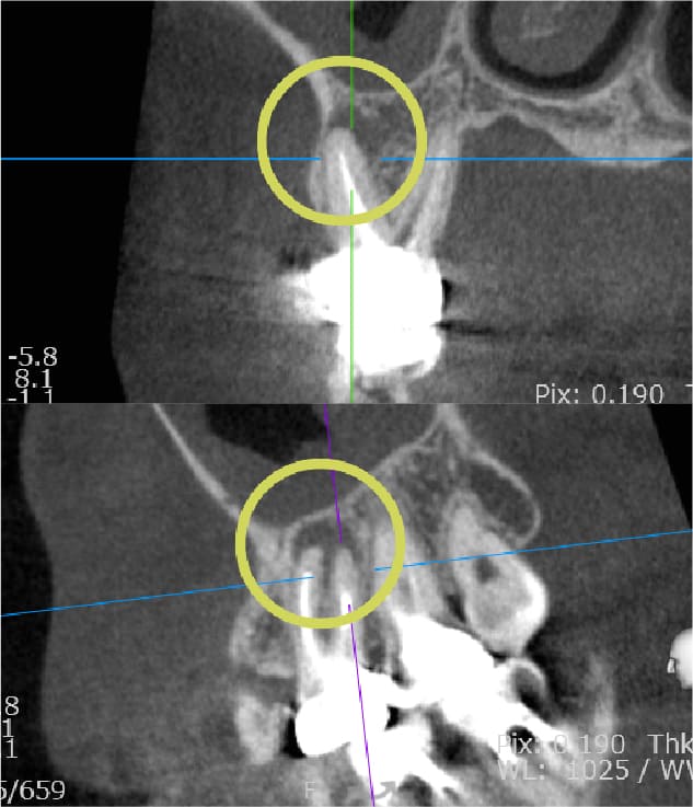 | 概要 | 右上の痛みを訴えて来院されました。 CT撮影の結果、右上6番の根尖に黒い影があり、上顎洞内の粘膜も炎症で厚く腫れていることが確認できました。 被せ物と土台を外し、ラバーダムを装着したうえで根管治療を行いました。 この患者様は自費の根管治療を希望され、マイクロスコープを使用して感染除去を行い、充填材にはMTAを使用しています。 術後の経過は良好で、黒い影は消失し、上顎洞の炎症も改善していることが確認できました。 |