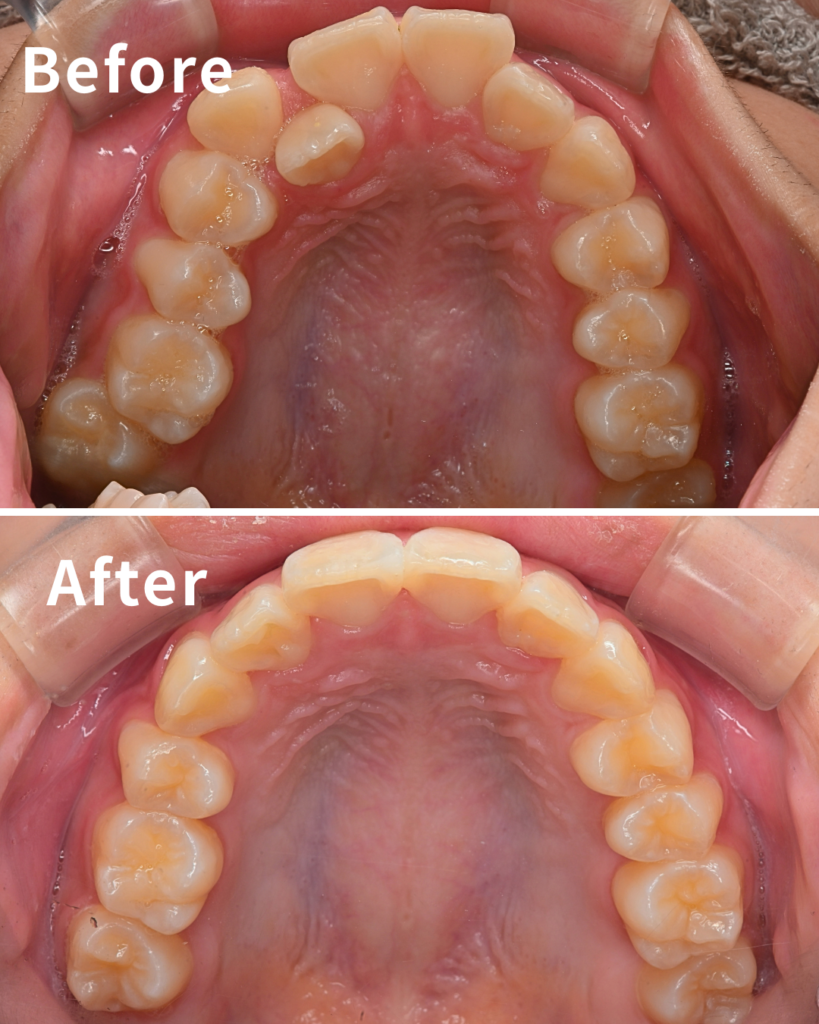 | 治療経過 | 右上の2番目の歯が大きくずれて生えていました。診断の結果、右側が著しくスペースが不足していたため、右上4番の抜歯を行いました。1回目のマウスピース(32枚)で抜歯してできたスペースを利用して反対咬合となっていた前歯や歯のがたつきを改善し、その後、追加で2回マウスピース作成を行い、細かな噛み合わせの緊密化を図りました。仕上げに、先端が摩耗して左右非対称となっていた前歯の形態をダイレクトボンディングで修復しました。現在はリテーナーによる保定を行っていただいております。 |