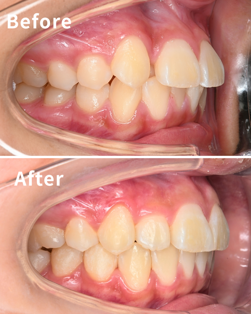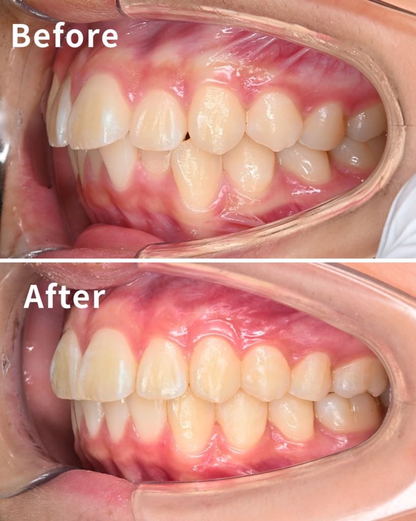 | 治療で気を付けた点 | 治療で最も留意したのは、「臼歯(奥歯)の咬合関係を狙った位置に持っていくこと」です。抜歯スペースを閉じる際、対策を怠ると奥歯が前方へ移動し、患者様にとって理想的な噛み合わせが崩れてしまいます。今回はアタッチメントの設計と顎間ゴムの併用により、奥歯の位置を強固に維持(アンカレッジコントロール)しながら前歯を後方へ移動させました。これにより、出っ歯になることを避け、審美性と機能性の両立を実現しています。 |
